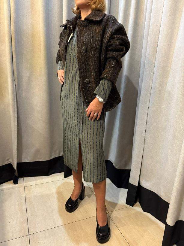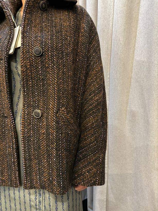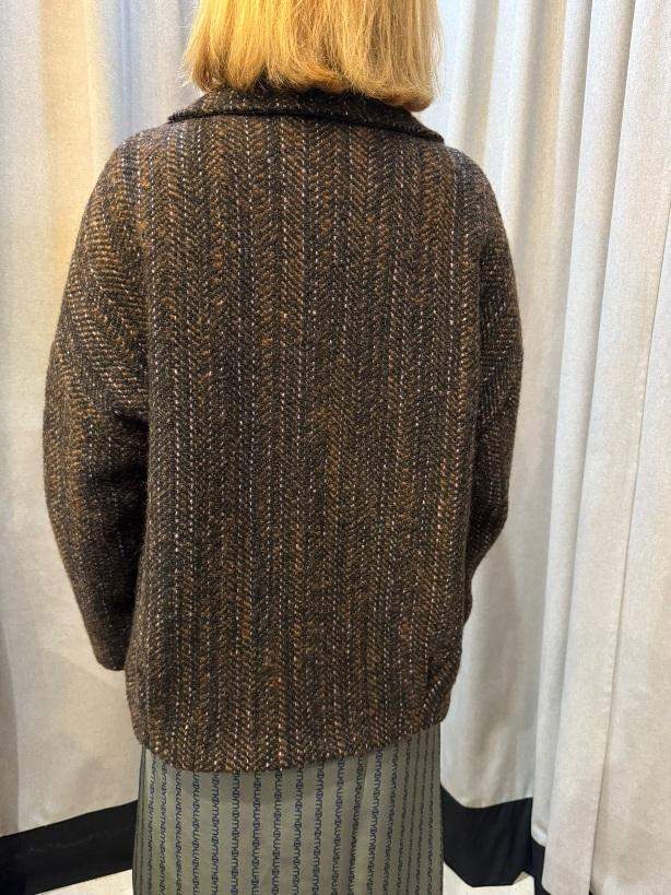 Piękna kurtka wykonana z dziewiczej wełny najwyższej jakości w brązowym kolorze z delikatnym liliowym prążkiem. Z tyłu kurtki od dołu są dwie zaszewki.