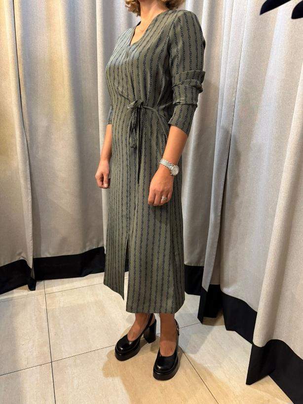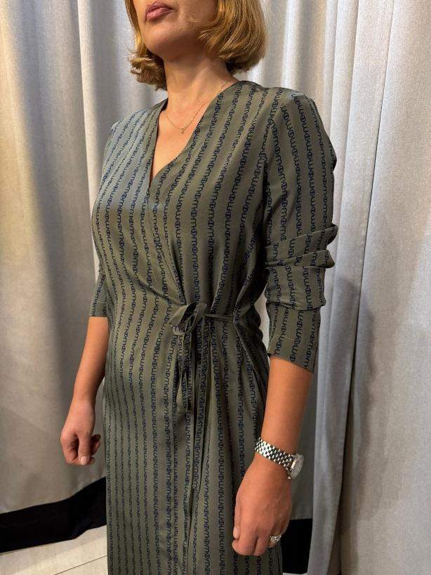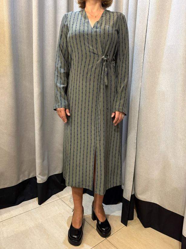 Jedwabna sukienka marki Momoni. 100% jedwabiu. Sukienka ma długie rękawy bez mankietów. Dekolt w delikatny serek. Z boku sukienka posiada wiązanie. Od dołu małe rozcięcie.